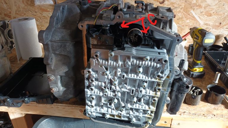 Kontrollieren Sie beim Ausbau der Mechatronik die Punkte 2 und 4, ob Sie diese befolgt haben + achten Sie darauf, dass das Kunststoffteil der Mechatronik nicht mit dem Getriebedeckel in Berührung kommt – damit dieser mit der gesamten Mechatronik leicht herausgleiten kann – damit das Kunststoffteil der Mechatronik bei der Demontage nicht bricht.