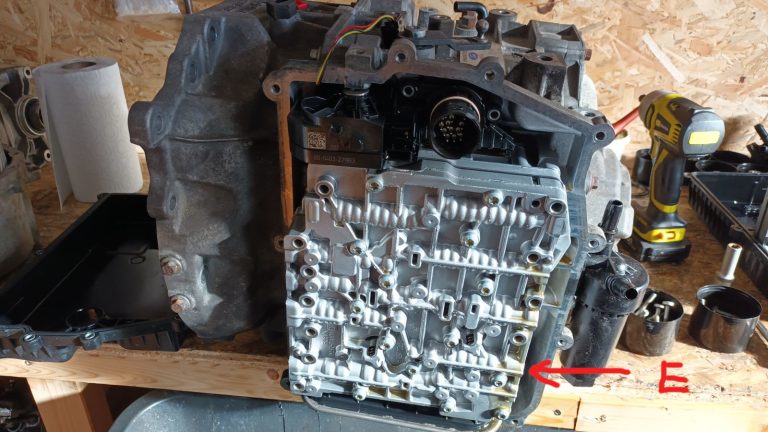 6. Hebeln Sie es mit einem Schraubendreher an der in Bild E gezeigten Stelle auf, ziehen Sie die Mechatronik vom Getriebe ab und entfernen Sie sie anschließend.
