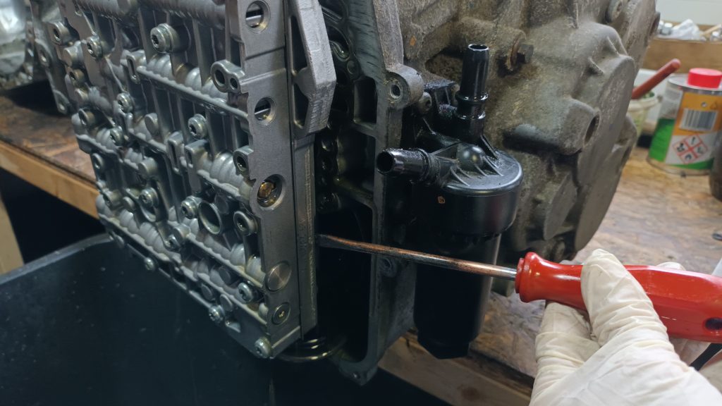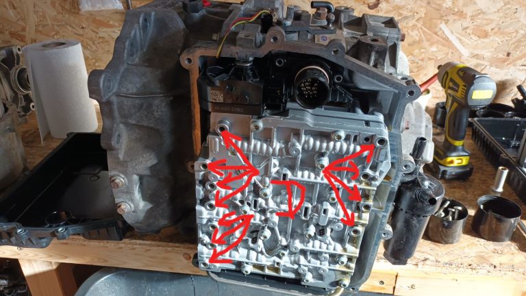 Pri vyberaní mechatroniky skontrolovať bod 2 a 4 či ste dodržali + dať pozor aby sa plastová časť mechatroniky neskrižovala s obalom prevodovky – aby sa ľahko vysunula s celou mechatronikou — nech nedôjde k polámaniu plastovej časti mechatroniky pri demontáži.