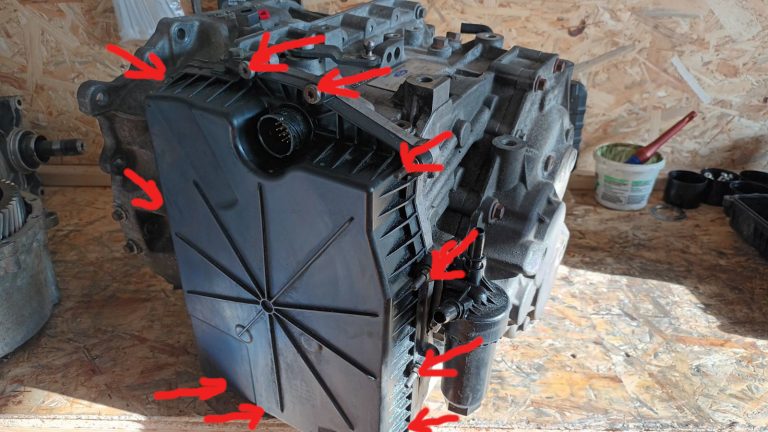 5. Vložíme mechatroniku do prevodovky, zaskrutkujeme 2 skrutky Torx T25 (A na obrázku) a dlhú vonkajšiu skrutku M10 (B na obrázku)